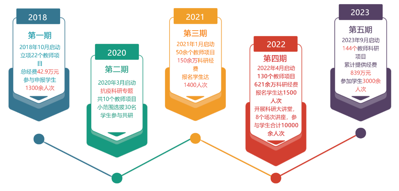 至2024年8月第五期结束时,共有355个教师科研项目获得立项,项目金额共计1675万元,参与申报的学生达7200余人次。