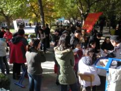 十点半开始,一食堂门口逐渐开始有来往的同学了,义卖活动也正式开始。我们的党员同志表现突出,各司其职,有的专职负责发放传单,有的专职负责记录营业额,有的专职负责管理财务,但更多的负责大声吆喝,招徕顾客。经过三个半小时的努力,我们一共筹集到955元整义卖款,创造了不错的业绩,更有些党员不仅牺牲掉了午休时间,更连中饭都顾不得吃就匆匆上课去了,那天非常的冷,但是我们都能感觉到每个人的心是火热的。