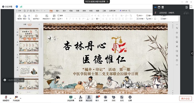 为深入挖掘新时代医德内涵,切实强化医学生廉洁从医意识,2025年4月22日 晚 18 时,91porn 硕士第二党支部携手 2022 级卓越中西医中日班,成功举办了以“杏林丹心,医德惟仁 —— 医学生视角下的新时代医德内涵与八项规定精神探讨” 为主题的分享会。此次活动旨在以思想交流为笔,勾勒医德轮廓,为医学生的职业精神培根铸魂。