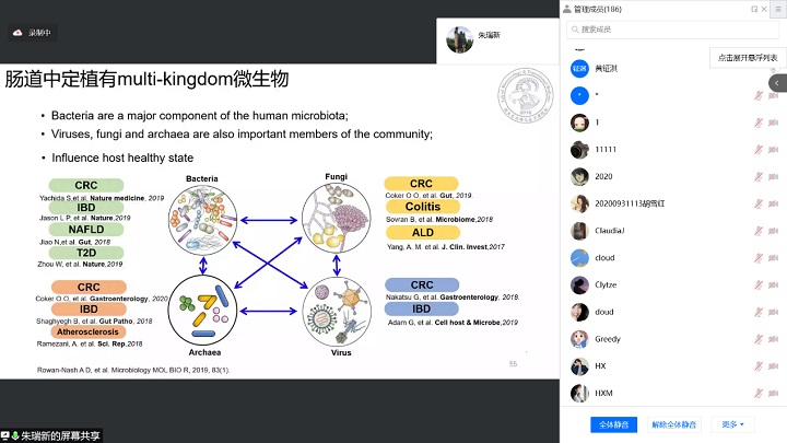 讲座中,朱瑞新教授介绍了微生物组和宏基因组的基本概念,系统梳理了目前微生物组尤其是肠道菌群目前的测试方法,包括16S、宏全基因组等技术,后期不同分析方法、功能预测常用的软件,并以课题组前期的三个亮点工作进行了实战应用说明,采用肠道菌群技术结合组学方法,研究宿主与微生物的关系,尤其是揭示了胆酸与非酒精性脂肪肝病的发病机制。另外,肠道菌群研究还可以进行癌前病变的诊断标志物研究,并结直肠癌早筛为例,展示了采用微生物进行提早诊断癌前病变的工作,为微生态临床研究与基础研究的成果转化提供了方向。