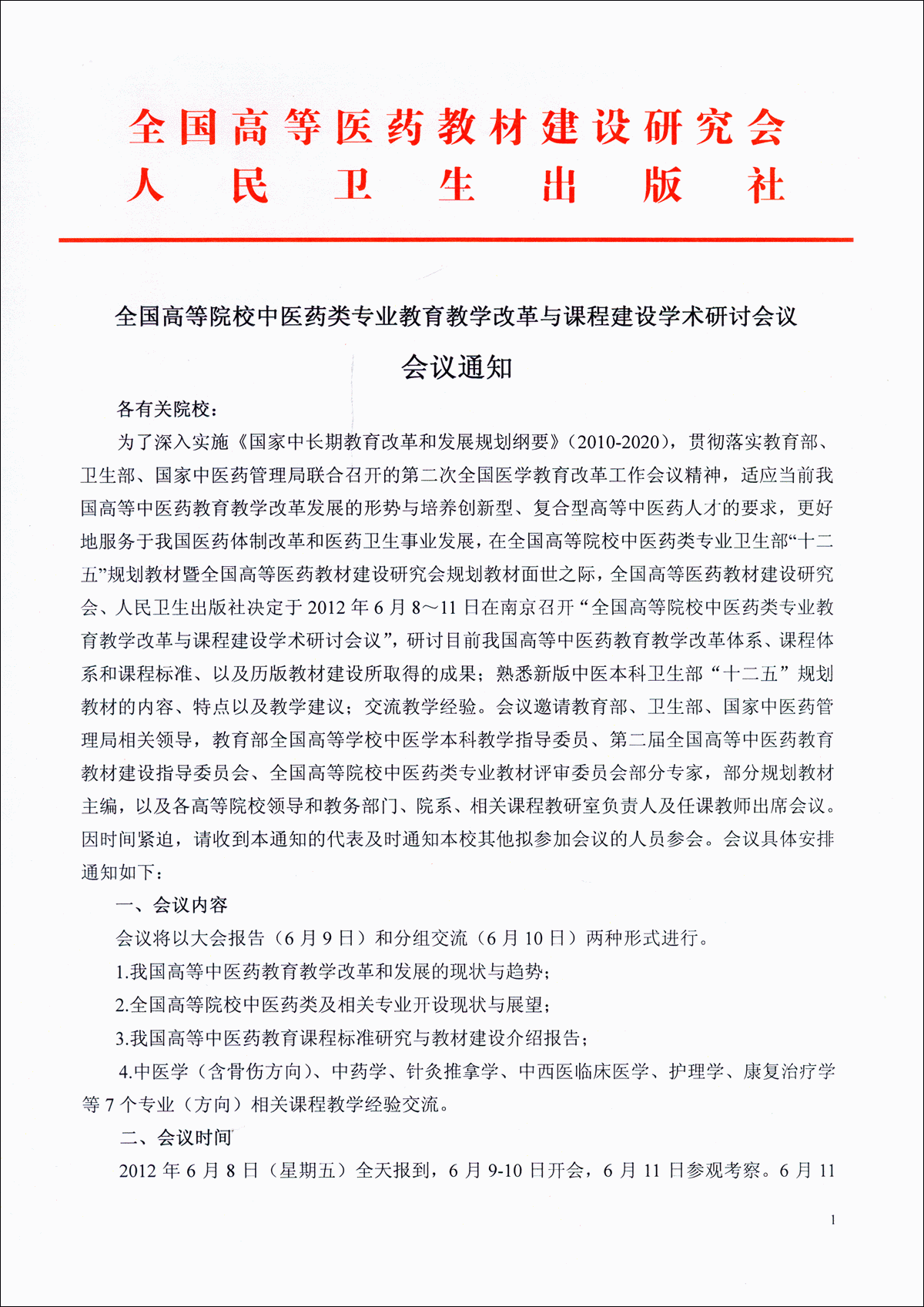全国高等院校中医药类专业教育教学改革与课程建设学术研讨会议会议通知