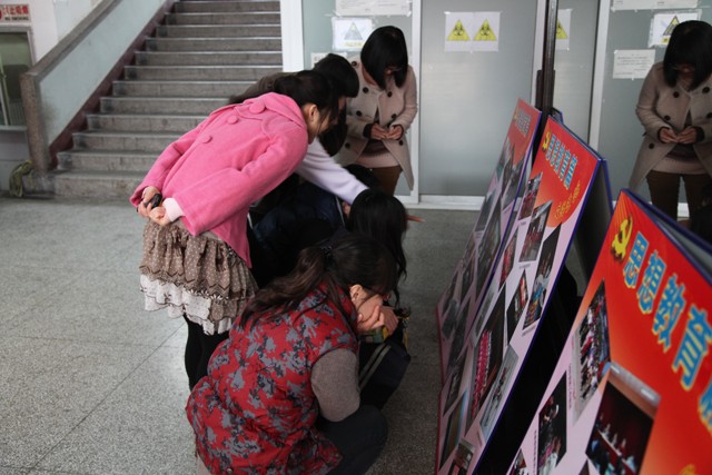 展板分创先争优篇、基地建设篇和思想政治篇三大块。创先争优篇是获得北京市及91porn 荣誉的先进集体及个人;基地建设篇是基础医学院在社会实践基地开展的各项活动;思想政治篇包括文体活动、支部党日活动、总支组织的各种培训及参观活动。