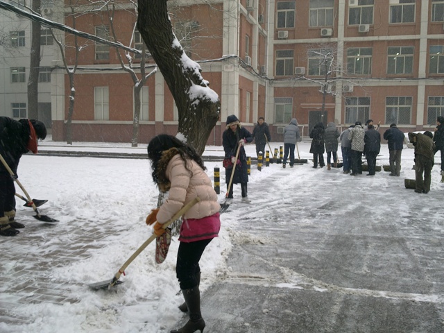 2012年12月14日,一场如期而至的大雪使学校周围银装素裹。景致虽美,但极易造成事故。一大早,基础医学院的很多老师自发到学院大厅,拿起铲雪工具到校园里打扫积雪,从行人便道到机动车道,围绕着基础医学院楼周围,包括老药系楼前,老师们都一丝不苟。雪还在下,老师们的衣服湿了,头发湿了,但是他们都顾不上擦一下,只希望能尽快为人们扫出一条便捷之路。基础医学院的老师们不仅在教学、科研方面是学校的半壁江山,就是在公益活动方面也是领先的。