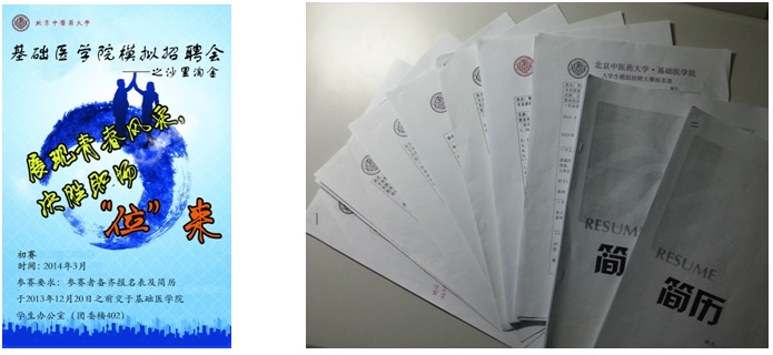 启动于2013年年底的基础医学院大学生模拟招聘大赛之沙里淘金近日落下帷幕,本次模拟招聘大赛简历选拔赛得到了来自于各个年级同学们的积极响应。本次模拟招聘初赛简历选拔阶段,共收到来自我院研究生、本科生各个年级简历百余份,经评委初步筛选,最终有22份优秀简历入围今年我院模拟招聘大赛的复赛比拼,据悉模拟招聘大赛复赛、决赛将在4月初正式开赛。