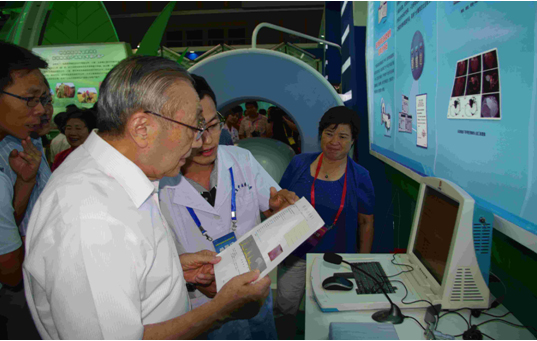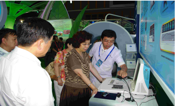 历次展会都备受社会各界的重视和关注,有众多国内群众和国外代表体验了数字化的、量化的中医诊断(图2、3、4、5)。中共中央政治局委员、国务委员刘延东,原党和国家领导同志宋平、李岚清、曾庆红、宋健,科技部和河北省委、省政府领导同志等亲临我校展台参观并询问有关研发情况(见图6、7、9),“中医四诊合参辅助诊疗仪”受到了科技部的高度赞扬。